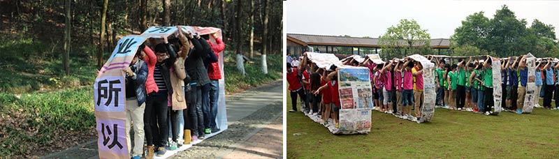 每个组用提供的材料将报纸围成一个可以行进的履带式的环,要求本组所有成员根据要求走完规定的路程,以最快到达终点的组为优胜。这个项目分履带制作和竞赛两个阶段,是一个综合性比较强的项目,它能让学员体会团队协作的重要性,考验学员的动手能力。